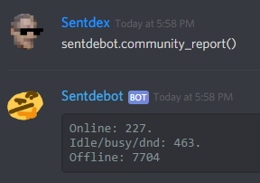 So, to begin, sometimes it's cool to track a server's total users, and online numbers. Eventually, it'd be neat to just track these over time to graph trends like overall usergrowth, active users, messages per hour...etc, just to monitor the overall health of your server. To begin, we need to know how to reference our actual server. As of DiscordPy 1.0.0, your "server" is referred to as a guild instead. Prior versions were called server. So, first, I will reference the sentdex guild by its id: