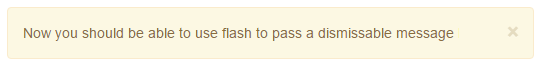 Then, we use the div class of "alert," which is part of Bootstrap. From there, we add a nice little button (again, Bootstrap!), and we even give this button the ability to dismiss the message, which will make it disappear thanks to a nice little javascript function, which, again, is all thanks to Bootstrap!