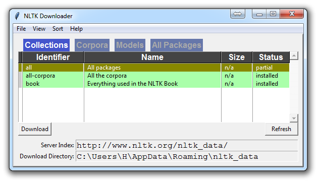Choose to download "all" for all packages, and then click 'download.' This will give you all of the tokenizers, chunkers, other algorithms, and all of the corpora. If space is an issue, you can elect to selectively download everything manually. The NLTK module will take up about 7MB, and the entire nltk_data directory will take up about 1.8GB, which includes your chunkers, parsers, and the corpora.